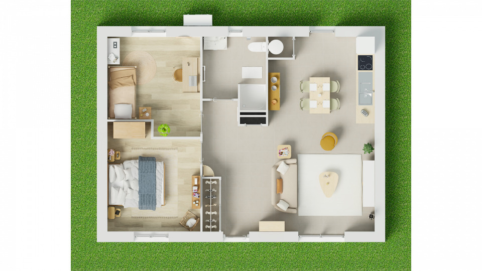 Ce plan de maison est conçu pour répondre parfaitement aux besoins des investisseurs immobiliers cherchant un bien à forte attractivité locative. Avec un agencement optimisé et conforme aux normes PMR (Personnes à Mobilité Réduite), cette maison garantit accessibilité, confort et fonctionnalité pour tous les occupants.