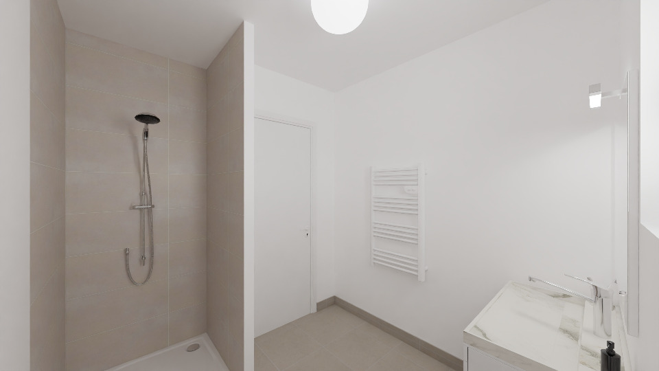 La partie nuit est composée de deux chambres confortables (10,15 m² et 11,16 m²), idéales pour accueillir des locataires ou une petite famille. La salle d’eau de 5,05 m², entièrement adaptée aux besoins des personnes à mobilité réduite, est équipée d’une douche à l’italienne et d’un agencement ergonomique. Le dégagement compact (1,34 m²) facilite la circulation fluide dans toute la maison.