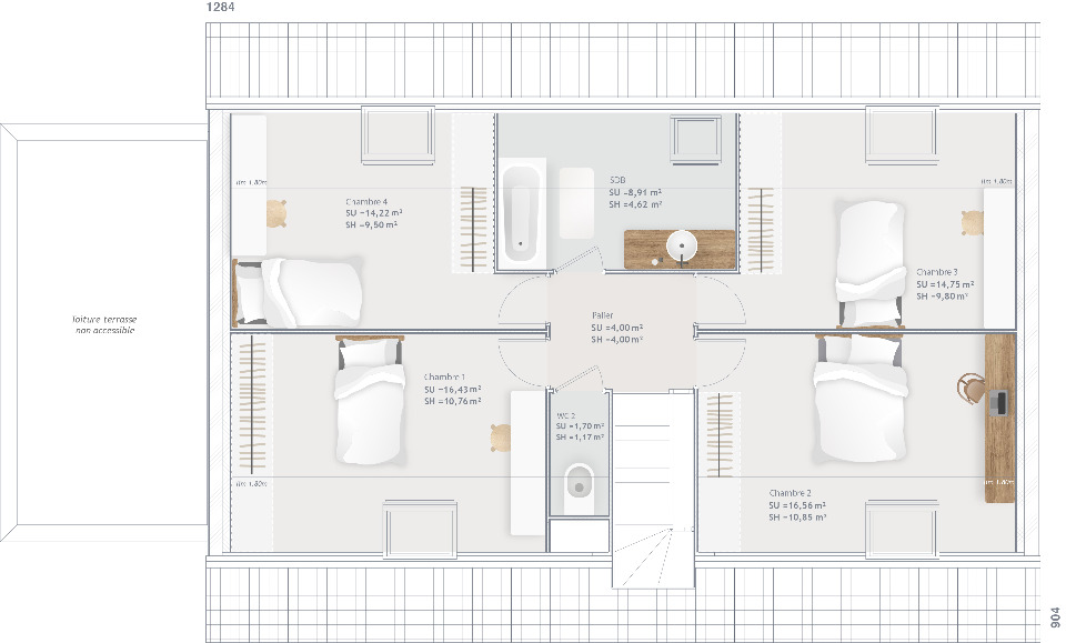 Cette maison possède 2 niveaux. Elle comporte six chambres, une cuisine et deux salles de bains. La maison est neuve.