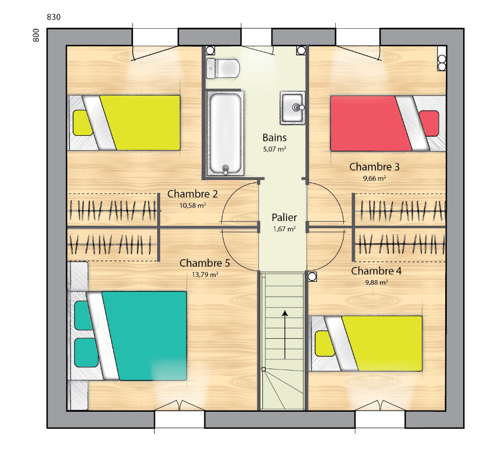 Cette maison compte 2 niveaux. Son intérieur dispose de cinq chambres, d’une cuisine et de deux salles de bains. Cette maison est neuve.