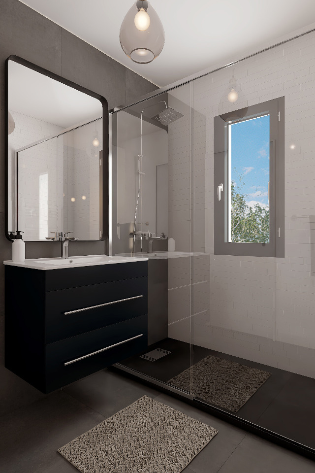 De nombreuses prestations incluses: tuiles en terre cuite, menuiseries couleur, volets motorisés et centralisés (coffret non visible intégré dans le mur), pack domotique, RDC et pièces d’eau carrelage imitation parquet, construction en brique, charpente traditionnelle, RE 2020, assurances incluses et raccordements.