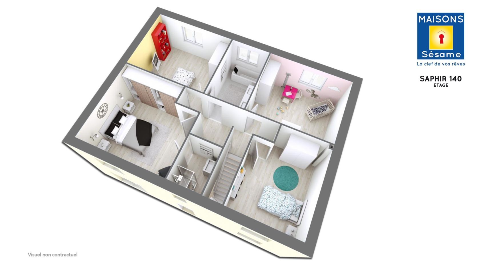 Le modèle SAPHIR 140 offre une surface habitable de 138 m², avec un design élégant souligné par son fronton sur la façade, lui conférant une touche raffinée et chaleureuse.