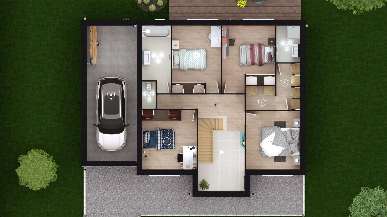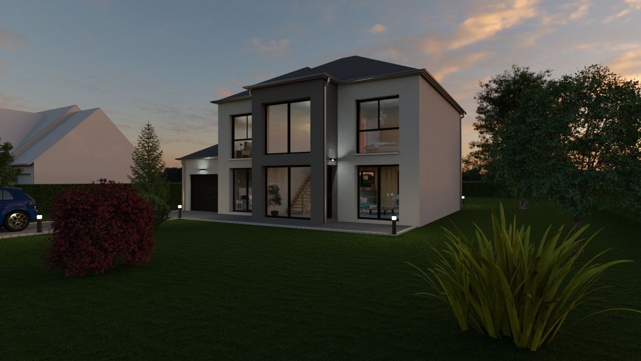 Surface vitrée exceptionnelle, originalité de sa toiture à pentes multiples, 150 m2 habitables, 5 chambres et garage, cette maison a plus d’un atout pour séduire les amateurs de beaux espaces. Notez le garage prévu pour 2 voitures, pourvu à la fois d’un accès cellier et d’un accès direct au jardin. Les coffres de volets électriques sont, bien-sûr, comme sur toutes nos maisons, invisibles. Ils sont program- mables grâce au pack domotique TaHoma qui est inclus de base sur tous nos modèles Premium. Nous tenons notre promesse Énergie positive même en cas d’exposition Défavorable !